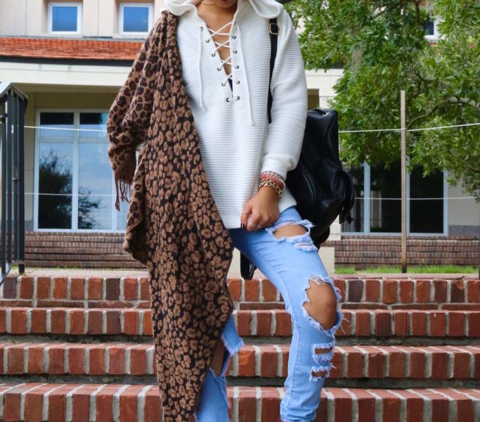The answer to your question is simple. Your style begins with a blank canvas. This Fashionista chose to combine a light pair of ripped jeans and a white lace-up pullover. Those two components can direct you in the right path, as the whole ensemble may be originated from common closet items.