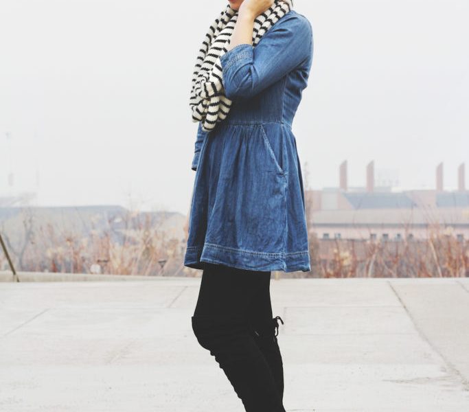 This outfit is one of my favorite denim dresses because of the fit, but more importantly because of the pockets. I live for pockets! I paired the dress with super warm tights, sometimes I think they are better than jeans and over the knee boots. To bring this whole outfit together, while avoiding cold metals, I opted for this infinity scarf.