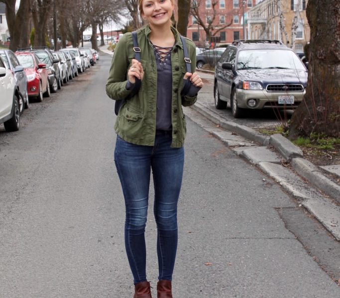 This Fashionista is dressing so cute for class. She somehow pulls off a winter/spring look, as we do not know what season it is up here in Pullman, Washington. Her olive green cargo jacket keeps her warm and trendy. Olive green is a great color this season and will match anything in your closet. With a cargo jacket, you could add some patches or splattered paint to make it a statement jacket of the year.