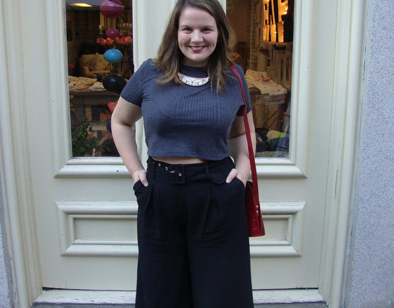 However, I can clean up pretty nicely. In these photos, I’ve put together a polished look totally appropriate for back-to-school activities. Though super classy, this ensemble is complete with one of the most popular long-term trends right now, a clean pair of culottes. I then added a plain tee and gray heels to keep the look simple. To top it off, though, I accessorized with a bright red handbag for a gorgeous pop of color (mine’s a Goodwill find but this is just as fab!). I ended with minimal jewelry to make the look sparkle a little.