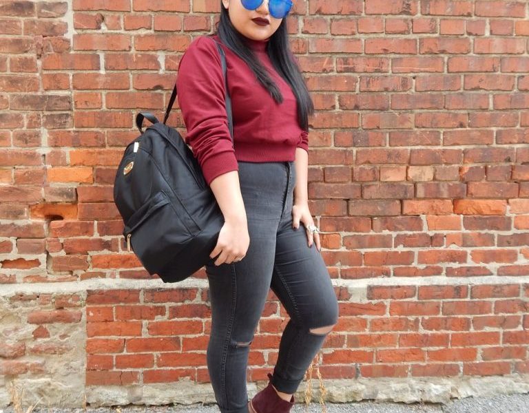 Sweaters are a staple for fall. This Fashionista rocks a high neck sweater in the ever-trending burgundy color. Burgundy is such an on-trend color for fall that it could almost be used as a neutral in a lot of outfits. She kept with the trendy color for fall by matching some ankle booties, nail polish and a liquid lipstick to her sweater. The monochromatic feel pulls the whole look together and keeps her looking polished and chic for classes.