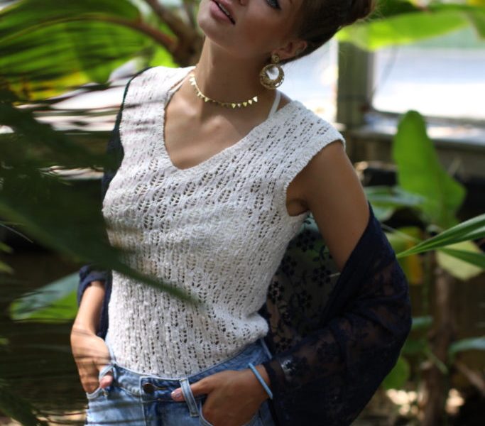Next, I pulled out a newly acquired crochet top from my boyfriend’s mom. I decided to take this look in a different direction and pair it with some distressed cutoff shorts, a cream bralette, and a navy kimono. To complete this boho-inspired look, I added lots of mixed-metal jewelry and some ash-blue booties with lace socks.