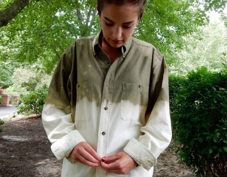 The second flannel shirt was completely olive green until I got a hold of it. In order to successfully dip-dye your fabric, start by filling three buckets: half water and half bleach, pure water, and half water and half vinegar, respectively. Dip your flannel shirt in the water-bleach solution first to strip it of its color, which creates an ombré look. Once you achieve your desired color, dunk it in the water bucket to get rid of the bleach. Lastly, dunk your flannel shirt in the water-vinegar solution to stop the bleach from bleeding. After it dries, wash the shirt alone before wearing it so the bleach doesn’t ruin any other clothes or irritate your skin!