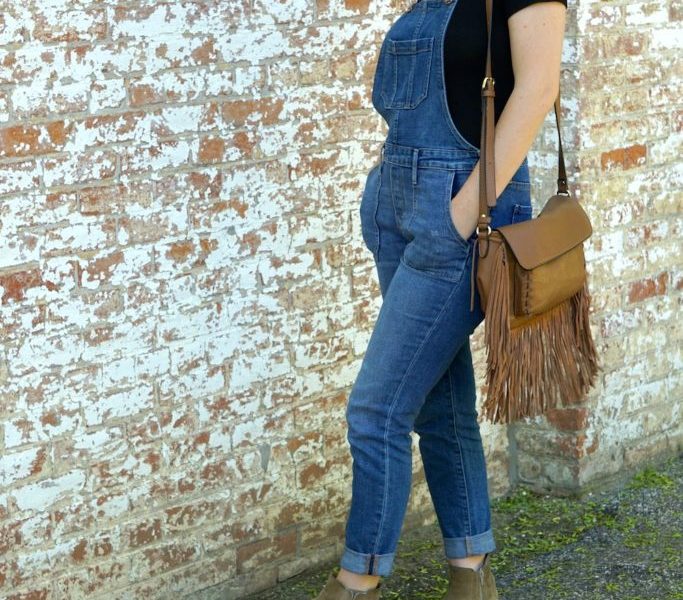 I like to think of the first look is an urban take on the adventurer. For this look I paired the overalls with a black bodysuit. Bodysuits work great with overalls because you don’t have to worry about your shirt bunching up inside of the overalls. I also added my favorite pointed toe booties, fringe bag and wide-brimmed hat to give the look a little vintage vibe. I love to wear this outfit when going to the farmers market or grabbing coffee.