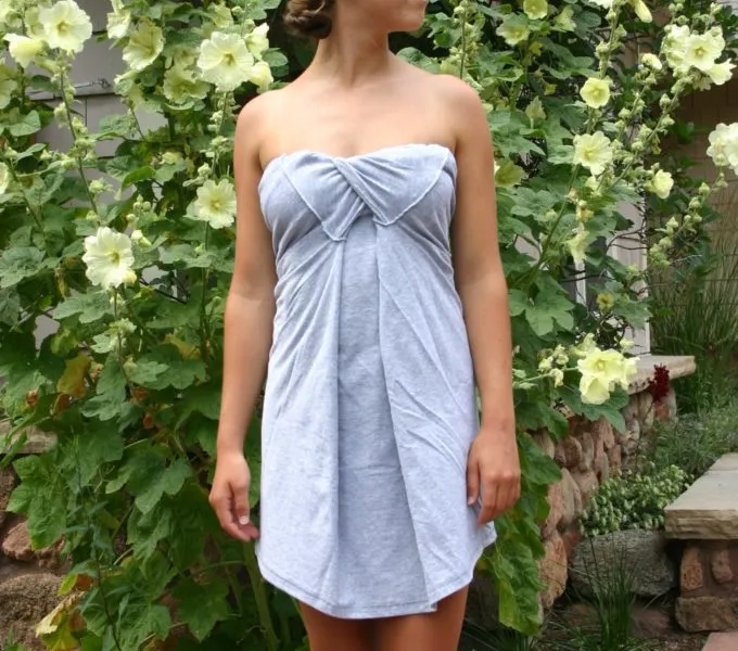 1—The simple, strapless dress. This is the simplest, easiest look, and you can make it in less than 10 seconds. Pull the sleeves behind, and then just tie them together—that’s it!