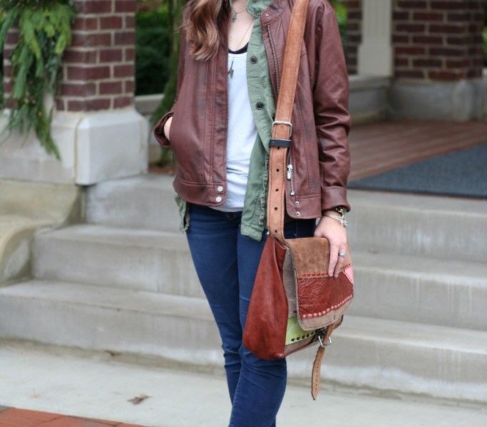 Layering multiple pieces under a good leather jacket creates an instantly classic, yet fashion-forward, look. By beginning with a subtle black layer, easing into a white layer, she created dimension between her skin and the light top. Next, the hunter green button-up, blending beautifully with the mahogany jacket, connects the outfit to her beanie.