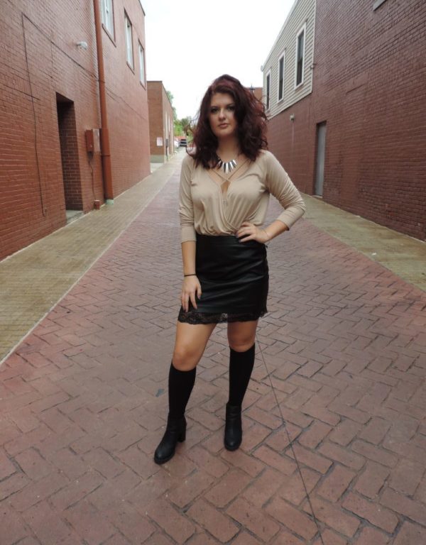 Being a freshmen on campus without a car can really suck when you’re a fashion major; I mean how will you get to the mall?? Well, you don’t have to go too far to find an amazing place to shop. Escape the dorm and take a step into your campus’ downtown. There may be many places to eat that are not just chicken tenders and fries and there are lots of boutiques. I found a hidden jewel; it was a little boutique called “Fig Leaf.” Something about personal owned shops is special. Look at it from a merchandising aspect; the owner has to personally pick out the merchandise, so not only will you be getting unique personal style clothing picks, but you will also get some of the most on trend fashions. I needed to pick up some things for the upcoming fall season and this was the perfect spot. I got this super soft and cozy V-neck crossed long sleeve blouse. Not only is it easy to move around in, but you can wear it tons of different ways. In these pictures I dressed it up as a transition into the fall weather with an elegant lace and leather bodycon skirt, booties and my absolute fave fall accessory, knee high socks. Now, this shirt can be dressed to the tens, but you can also throw it on with a pair of jeans, layer a flannel over top and tie it together with a pair of riding boots and you’ll score the perfect casual outfit to strut around campus in the autumn.
