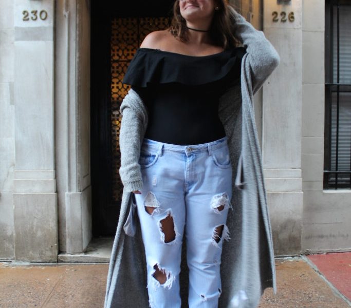 Well, ladies and gentlemen, luckily I have several Fashionistas for friends, one of which has agreed to help me devise a solution to that very unnerving issue. You see, the trick is to embrace the ambivalence. So you’re not sure if it’ll be sunny or cloudy, or hot or cold, or windy or rainy? Then take pieces that are somewhat opposed, both in color and in coverage, and throw them together! This Fashionista’s light wash ripped denim is perfectly indecisive, with just enough fabric to keep warm but also allow ventilation, and her long sleeve off-the-shoulder black bodysuit adds a grunge factor while keeping her warm but not *too* warm (will shoulder action ever get old? Maybe, but not yet…So let’s keep milking it). The color contrast between the two pieces perfectly sums up my feelings going into fall weather—my heart is with the sunny days but my body is with the “60 degrees and below” ones. But wait, that’s not all, there’s more! In fact, there should always be more: that’s the second tip, layer. It’s just as easy to put on a jacket or two as it is to take them off, which makes layering ideal for weather that changes throughout the day. In this outfit, the cardigan is kind of like that friend that you invite on a night out just in case your other friends ditch you—don’t get me wrong, I REALLY do like her, but she probably wouldn’t be here if I didn’t actually NEED her.