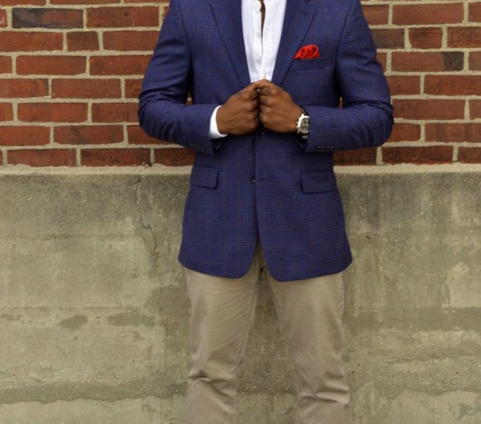 Next, he is wearing some generic khaki colored pants that every guy should own at least one pair of, to play off of the darkness of the blazer. Then, to tie it all together, this Fashionisto is rocking some Joseph Abboud suede shoes to bring the blue tones back together.