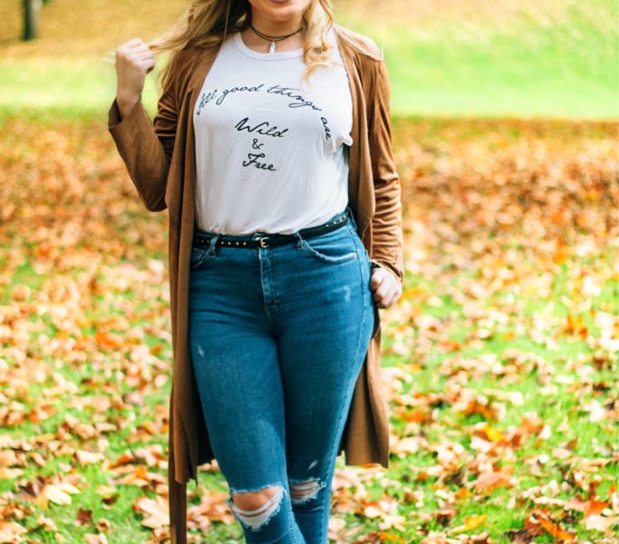 I went for a thin suede coat option so it can be an oversized look without being too heavy. In the fall and winter I am all about the layered appearance, but I don’t like to give up my figure so you have to play around with your body proportions. I paired a white graphic T-shirt with some distressed light wash jeans and leather marble choker. Offsetting the outfit with darker colors, I went for leather pointed boots, a studded black belt and my clubmaster sunglasses.
