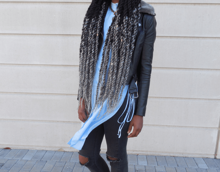 First of all, the black jeans with a small hole in the knee are a staple of the season, because they go with absolutely everything. Printed ankle booties are also a must-have this winter as they make any outfit look festive and the heel is also very short so they’re comfortable, but can be dressed up. The simple pop of color and pattern this Fashionista adds, turns a plain black outfit into something fun. Her long black to gray ombre braids tie together this look amazingly, complimenting all of the colors in the outfit. The gold accessory clasps on her braids also match perfectly with the gold statement necklace.