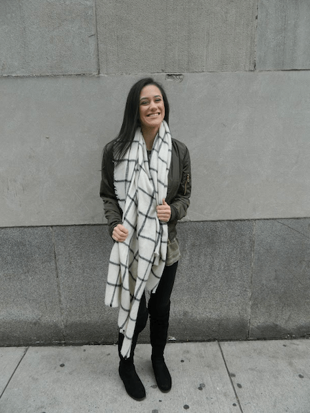I love how she wasn’t afraid to mix patterns and textures with her outfit. The military-camo boyfriend T-shirt she purchased from H&M flows symbiotically with her squared cream and black blanket scarf from Old Navy. The beauty of these scarves is that you can wear it anyway you want to. You can wrap it, belt it, layer it and twist it to make every #OOTD even cozier. Keeping warm, she layers her outfit with a frost-free quilted parka, lined with Sherpa. The additional built-in-layer with rib knitting traps warmth and allows this Fashionista to enjoy the winter in NYC in style.