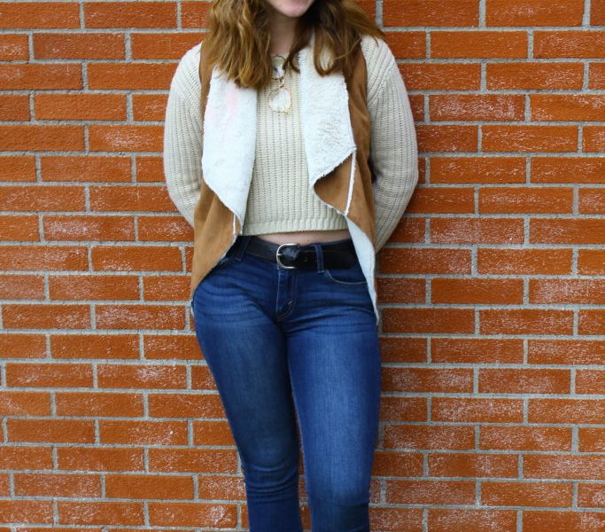 This month’s Fashionista has a smooth look that’s giving us total ’70s winter vibes. The piece that puts the look together is her suede fur lined vest which is from a thrift store. What really stands out is her choice of accessories. Her trendy, thin round glasses set us back into the groovy days. Her large black belt is subtle and simple yet edgy. All the pieces incorporated into this Fashionista’s outfit coincide with her color scheme, including her scrunchie.