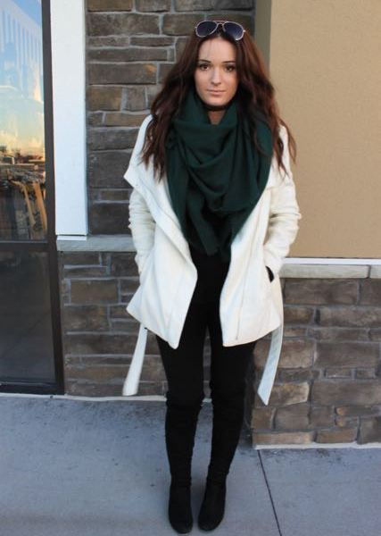This Fashionista is keeping warm while incorporating winter trends to her outfit. She is wearing a white winter coat, which is perfect for wearing casual like she is or dressing up for holiday events. Her black leggings and over the knee boots are a solid combination for winter weather and adding a trendy take on a casual outfit. Over the knee boots is my favorite trend from last year that still looks great with skinny jeans, dresses, and leggings! Lastly, she is accessorizing with a bold green scarf, black lace choker, and sunglasses. Wearing a green or any bold colored scarf with a white jacket is a classic look that is also an easy way to stay warm and stay fashionable. The choker is the up and coming go-to accessory that I see most girls wearing around my campus and is a great minimal necklace that adds an edgy, yet chic take on any look.