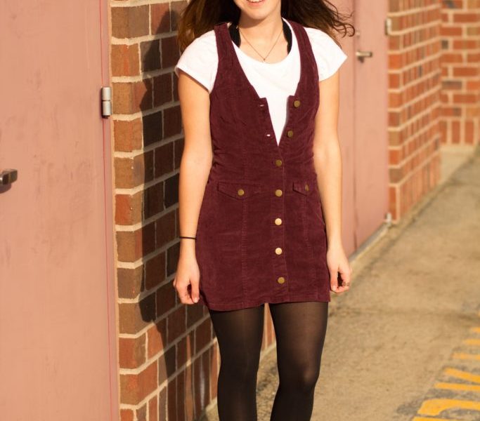 To start, I thought I’d give some professional-quality photographic justice to an outfit I’ve worn what seems like a 100 times this past semester. Here, I’m wearing a maroon, Urban Outfitters, corduroy, button-down jumper dress over a white T-shirt, with (and without) a hooded, black cardigan from Brandy Melville and a mini Fjallraven Kanken backpack. While the dress is out of stock, you can find a gorgeous zipper variety (for 50 percent off). The scuffed-up, well-loved boots are Nine West from DSW, but you can find a similar pair just about anywhere.