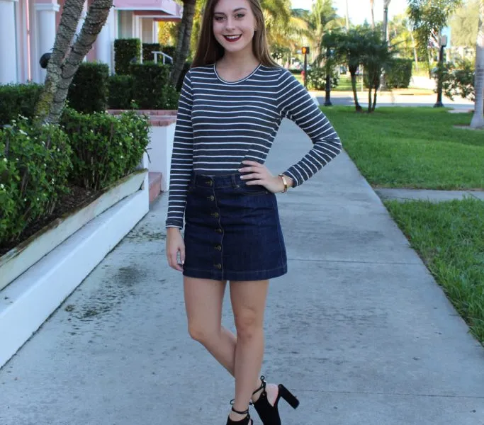 For this look, I paired a denim button up skirt with a light long-sleeve striped shirt and my favorite find, velvet peep toe booties! The luxurious texture of the velvet adds a sense of warmth to the outfit while the skirt plays down the long sleeve shirt making it the perfect outfit for a sun kissed winter day!