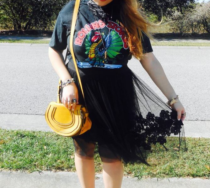 In this look, I am wearing one of my favorite skirts I picked up from the boutique I worked at during high school! The tulle gives it a feminine look next to the Rolling Stones dragon T-shirt on top. With all the darkness, I add a bright mustard bag, turquoise bracelets, edgy rings, and a pair of fringe booties to express my love of boho apparel. The black square scarf is also an accessory I love adding to any outfit! I hope you all love this look as much as I do, and check me out on my social media.