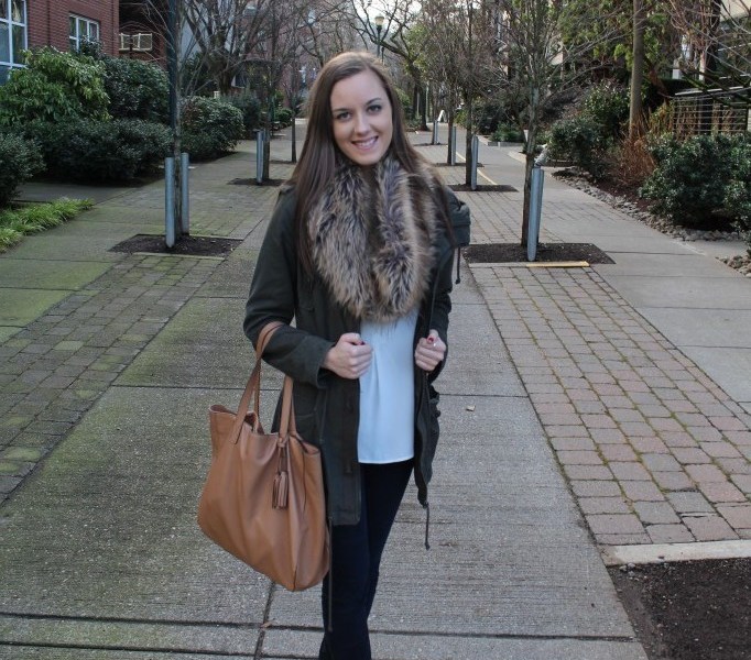 The Fendi show inspired me to go out and buy this faux fur cowl. I like that a cowl adds the necessary glamour to an outfit but still functions as an every day piece. It is warm and soft but also adds a statement to any outfit. As seen in the Fendi show, less is always more. Lagerfeld’s utilization of color, or lack thereof, helps to create a sophisticated look. I started simple with a white blouse, black jeans, and I layered my army green jacket to add function and edge to the look. The black suede boots are my favorite because of the stacked heel and elegant shape. To accessorize, I also kept it simple and used this oversized tote. As you can see from the picture, the bag is perfect for throwing in everything you need for an afternoon shopping in the city.