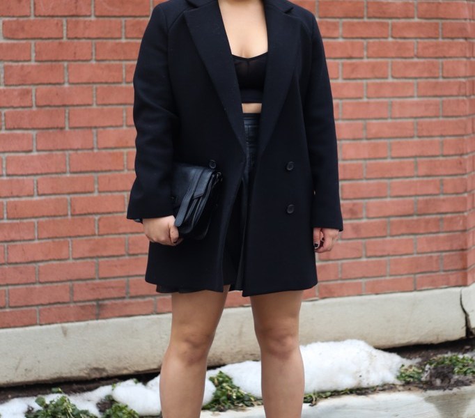 I wanted to imitate this contrast in my outfit, while keeping the focus on my structured, menswear-cut wool coat. I paired the coat with a high-cut leather circle skirt and spandex bralette to really play up the textures and add some interest to the all-black outfit. For accessories, I chose a square leather clutch that brings together some of the elements from the outfit. I finished my look with some heeled booties that can brave the winter streets.