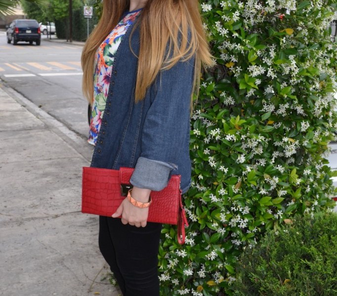 After checking my limited budget, I decided to do one of my favorite things in the world, online shopping! I loved the denim portion of the collection, so I bought a button-down denim shirt. Today, I had a coffee date planned with a friend I had not seen in a while, and I decided to use my new item for the first time. Inspired by the look I previously mentioned, I decided to use denim and black as the base for my outfit. Also, I thought it would be nice to use the color aspect of the original look. I wore a bright floral top with my button-down shirt over it, black high-waisted pants and nude heels. To complete the look, I used a red clutch and a peached colored bracelet.