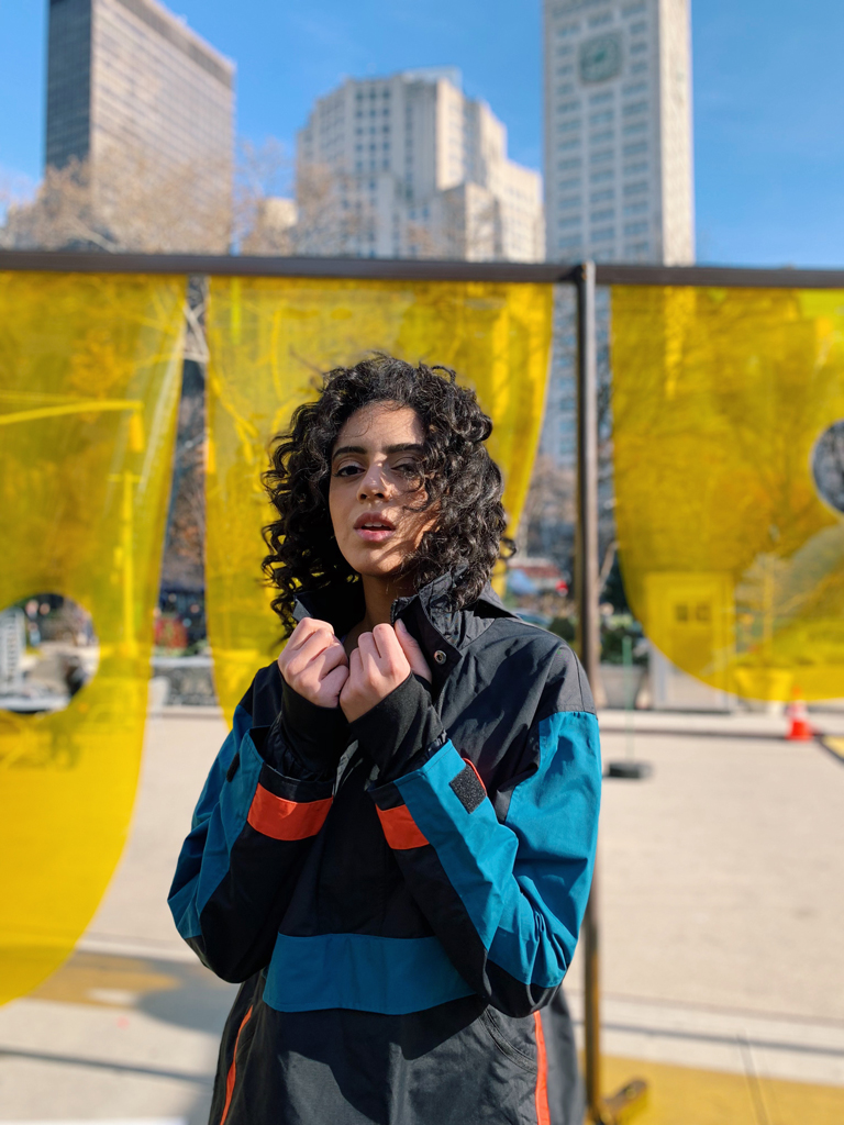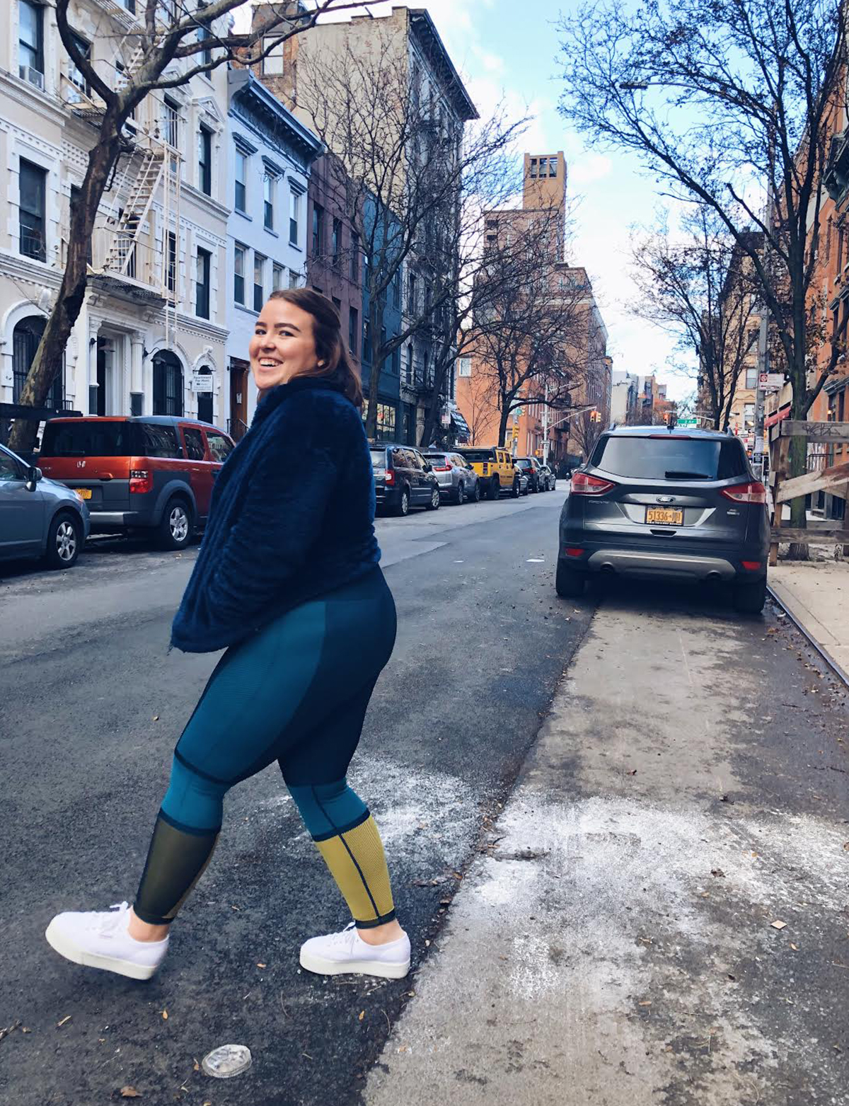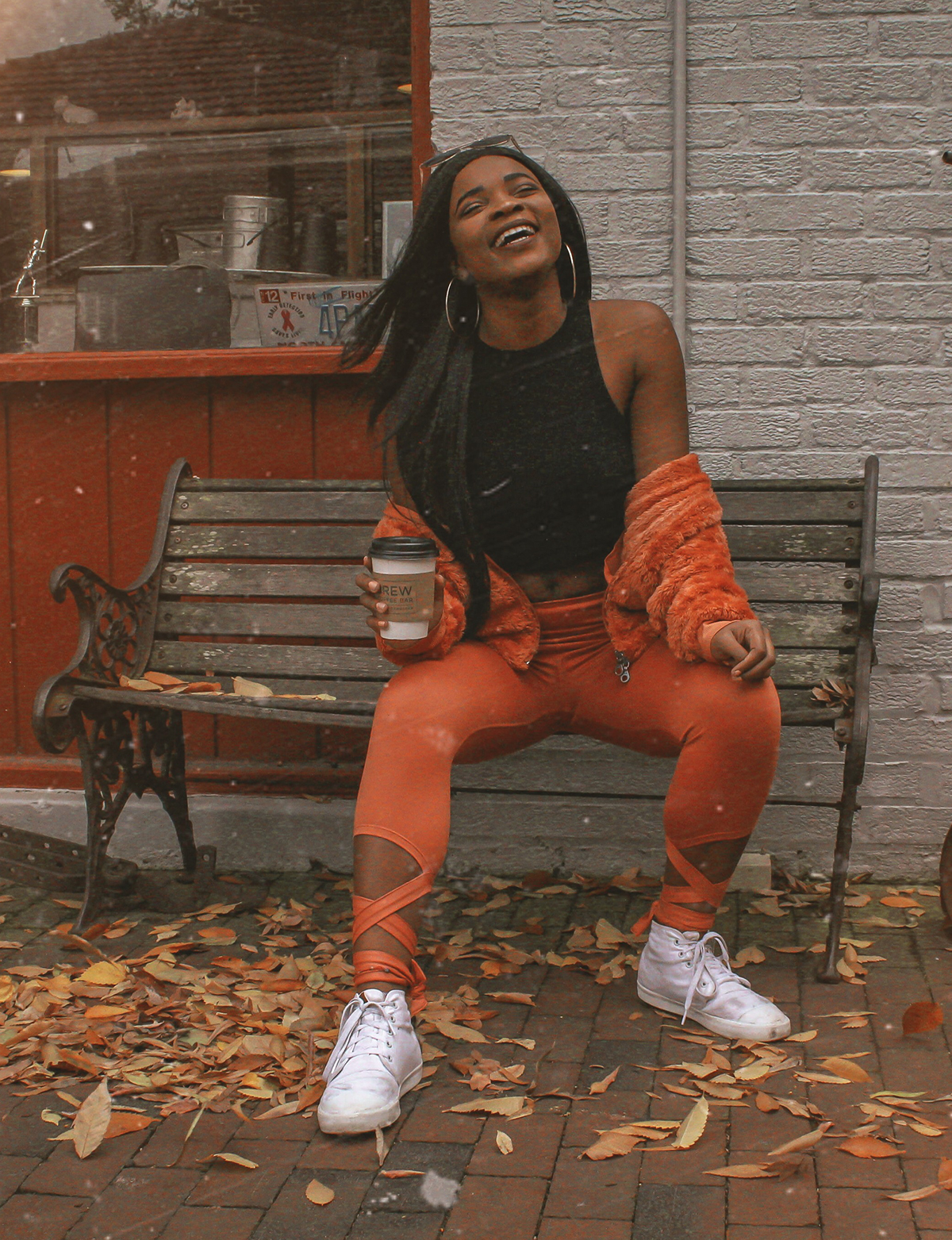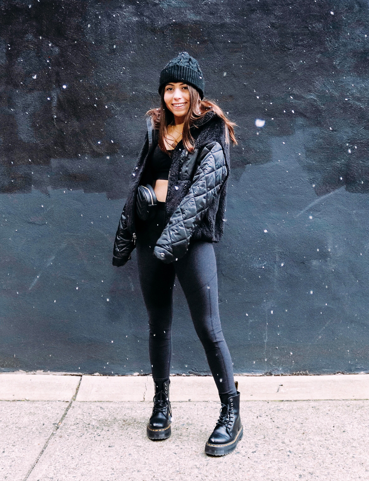 We can’t get enough of this quilted jacket, and we love how this community member styled hers with combat boots, a slouchy beanie, all-black leggings, and an on-trend belt bag.