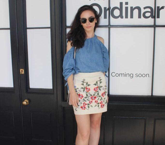 Spotted: A Fashionista enjoying the boujee London lifestyle. Here, she is wearing a high waisted flower printed skirt, with a unique denim blouse. She pairs this outfit with light brown wedge booties, a tan leather jacket, Ray-ban shades, and a pair of pearl earrings, adding a subtle touch. The fun top and printed skirt add a trendiness to the outfit because of the “in” styles and the earrings add a touch of elegance.