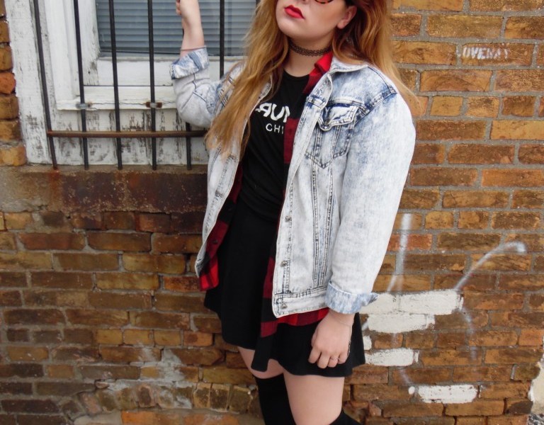This look has the ability to be preppy or grunge. Our Fashionista has clearly taken the route of grunge. All black ensemble with the needed pop of plaid, she is obviously ready to take on the day. The acid wash denim jacket gives way to her grunge look with those knee-highs and booties.