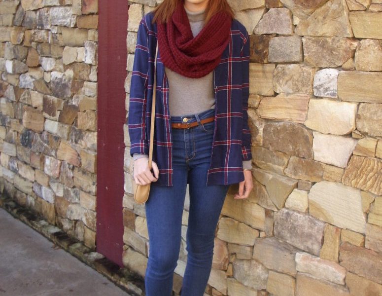 This Fashionista took the indigo and burgundy colors in her oversized flannel, unbuttoned to be used as a jacket, and ran with them. The simplicity of the plaid pattern compared to those on other flannel shirts provides an easier foundation for organizing the rest of the outfit. Busy plaid patterns can often times make an outfit look disorderly and overdone. Her heather gray turtleneck top worn underneath the flannel provides subtle and tasteful contrast with the knitted infinity scarf, which brings out the burgundy.