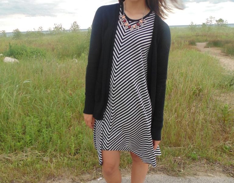 This Fashionista takes her neutrals up a notch with pattern and a pop of color. Her striped dress is a great foundation for her outfit, and the swing dress fit is super comfortable and easy to wear! Having a black sweater nearby keeps her cozy in the chilly summer Wisconsin evenings. Her gladiator sandals are not only trendy, but are the perfect height for going out with your pals and enjoying your night!
