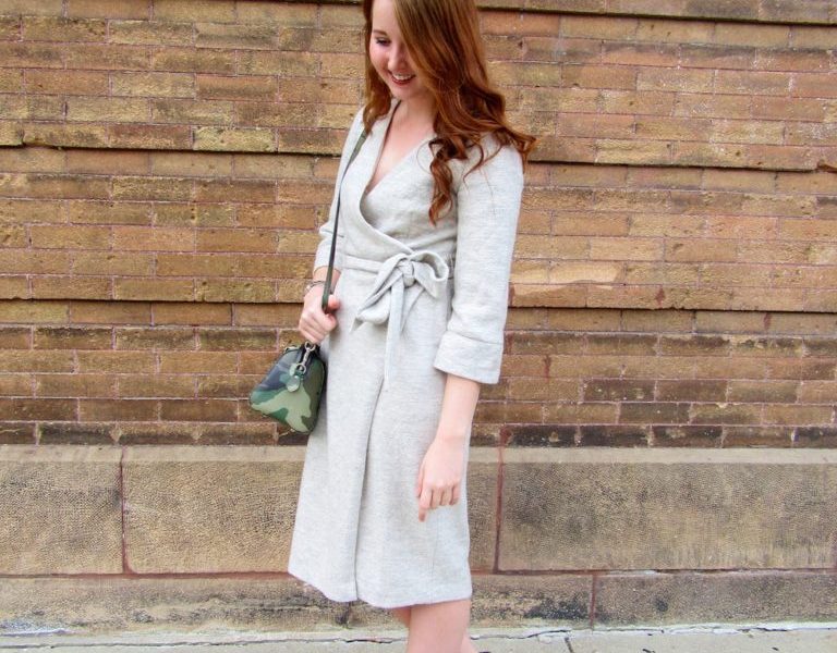 The clear staple item in this Fashionista’s ensemble is her midi-length, wrap dress from Banana Republic. The longer length of this dress makes it an appropriate option for work, but the wrap still accentuates this Fashionista’s waist so it’s more feminine and flattering on her body. The sleek Kate Spade silver watch and dangling bracelet this Fashionista is wearing stays in tune with the classic, professional look she’s going for. The real statement piece of this outfit is her camouflage, crossbody bag, which really adds some color and edge to the ensemble. Finally, this Fashionista finishes off her look with neutral-toned fringe booties, bringing in some boho vibes.