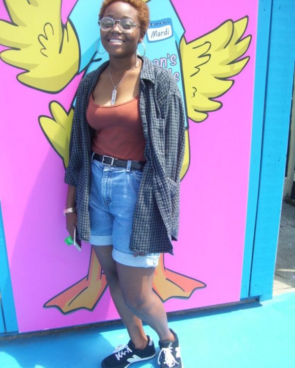 Her fairly simple outfit consisted of a plaid boyfriend flannel layered over a basic camisole, mom jean shorts, New Balance 574 sneakers. However, this Fashionista’s round-framed vintage readers stole the show. Without this Fashionista’s cool specs, this outfit would essentially be a simple tank and shorts, but the glasses really make these tie these individual pieces together to create a truly old school look.
