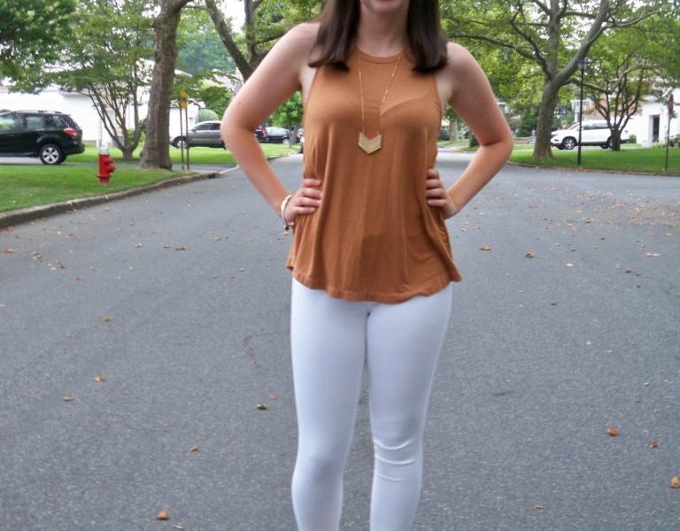 This Fashionista knows all too well the difficulties I just spoke about. She paired her statement piece necklace with a burnt orange colored sleeveless top from American Eagle Outfitters, white skinny jeans and chestnut, gold sandals. By using her statement piece necklace, the outfit is automatically dressier than without it. To match the gold and rose necklace, this stylish Fashionista chose to wear a gold mantra band bracelet, a gold Alex and Ani bracelet and a white and gold bangle to tie the whole outfit together. Statement piece necklaces are great for traveling back and forth from home to school because they are larger in size and harder to misplace them.