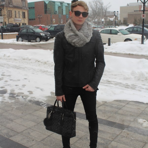 His entire all-black ensemble is from Zara, which includes the leather jacket, black ripped-at-the-knee jeans, a black pullover, and Chelsea ankle booties. His Danier fur infinity scarf, Michael Kors wristwatch, and a vintage black Coach bag pulled the look together. Without these key pieces, the all-black outfit would be too simple. As a finishing touch, he wore a pair of Ray-Ban inspired sunglasses from Zara.