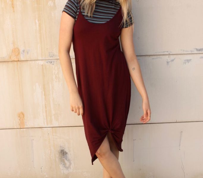 Her retro outfit payed a lot of tribute to trends of the past, which are reemerging as trends of the present. The blue and brown stripe color combo is super nostalgic, especially when used as a layering piece. Layering turtlenecks under tank top style shirts and dresses is not only really in, but a really good way of wearing your summer clothes year-round. The Fashionista’s maroon dress is a perfect fall color and the contrast against the turtleneck draws attention to one of the many little details hidden within this outfit: the dissimilar straps. One thicker and one thin strap are a unique feature but add a lot of personality to the simple dress. To reflect that asymmetry, the Fashionista tied up one side of the mid-length maroon dress. Another homage to the past are the Fashionista’s Dr. Martens. The ’90s grunge staple has seen a resurgence in recent years. The rebellious embellishment really plays down the dress, making it as casual as it is comfortable.