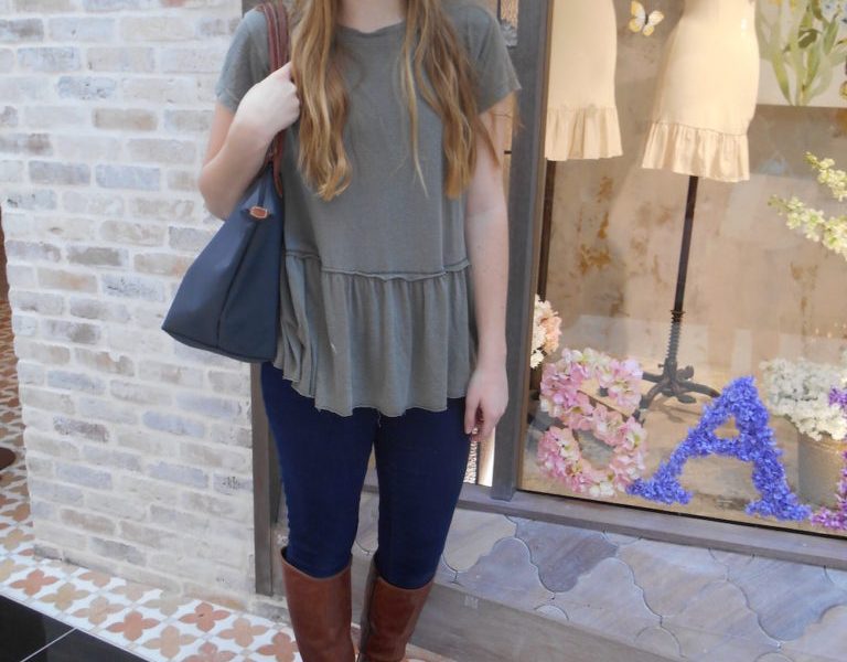 The olive color of her ruffle T-shirt is very on-trend, and it’s a great piece that can be dressed up or down. This Fashionista’s little accessories, like the dainty cross earrings and two delicate rings, show off her personal style and keep this look unique to her. These little accessories also make the outfit just a little bit dressier.