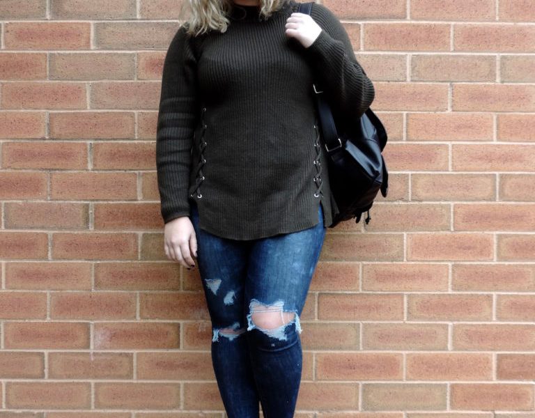 Personally, I believe accessories give winter outfits an edge. Accessories can transform a comfy sweater into an ultra chic piece by just layering on necklaces or throwing on a hat, like this Fashionista did. Also, hats can double as not only an accessory but a way to hide bed-head for those running late to class. In this look, she paired her trendy distressed jeans and forest green sweater with a wide-brim floppy hat and a cute leather backpack filled with necessities like textbooks and a staple lip color.