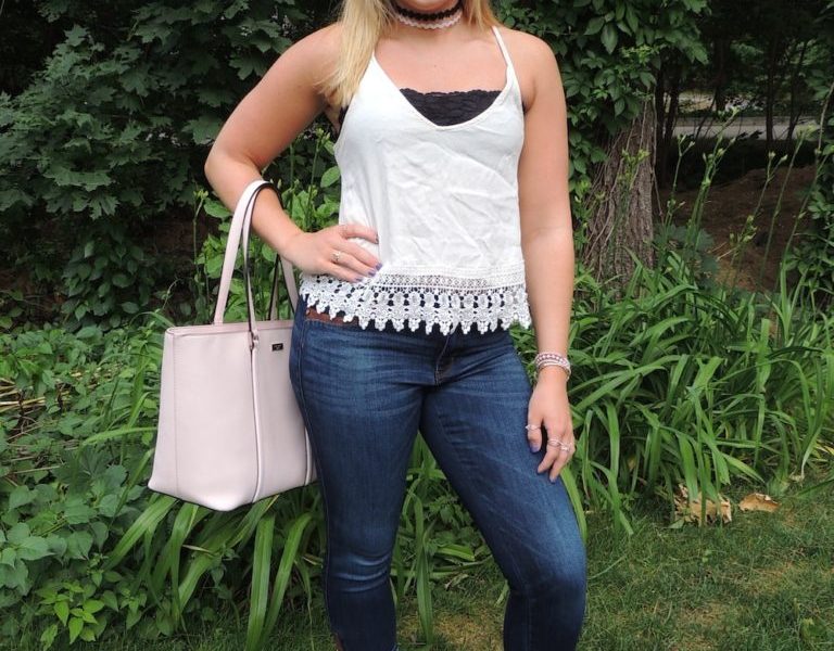 This Fashionista is wearing a white tank top and a pair of light wash blue jeans. Very fluky and appropriate for the summer time. Her tank top has a floral lace pattern toward the bottom, creating a girly and elegant look. She got creative and dressed this outfit up a number of ways. Chokers have been a huge hit this summer; therefore she paired two adorable chokers together to create a dauntless look. Her black bandeau and black choker pull the outfit together. Although she is wearing just a plain white tank top, she still attracts attention with her bold accessories.