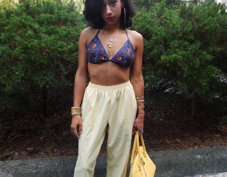 The embroidered bralette makes a daring statement without overstating the look, and some oversized pants helped make this look a bit more modest. My favorite part about this fit is the stacked bangles engraved in boho print. These bangles are classic and the only way to find them is at your local vintage consignment shops, but are well worth the hunt!
