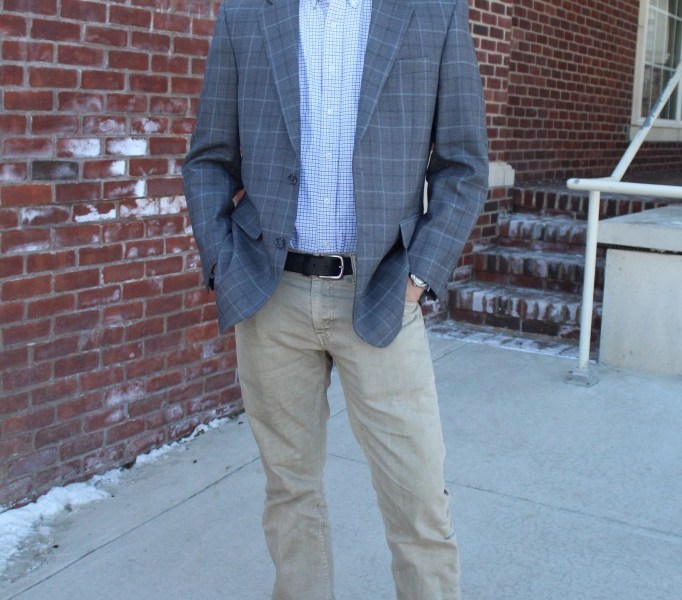 I spotted this Fashionisto, a marketing major, dressed perfectly for any campus function. He managed to maintain a professional appearance while not looking overdressed. He styled his button-down shirt with a pair of khakis and a patterned blazer. My favorite part about his look was the different patterned details of the shirt and blazer. Both prints were muted enough not to clash with one another, while the pairing still looked cool enough to keep this outfit from looking stuffy.