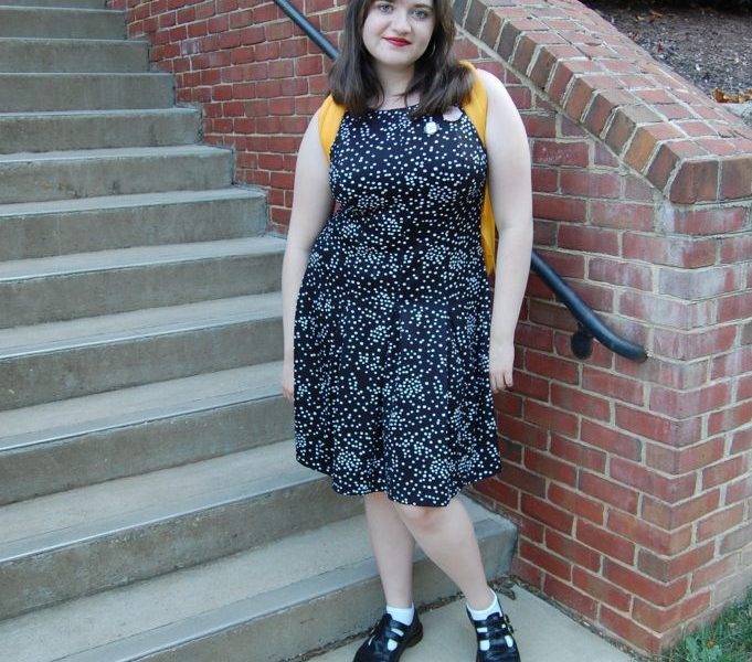 My roommate, Allison, is very good at using her accessories to change up her outfits and to incorporate her own personal style into everything she wears. In this outfit, she uses pins to express her taste in music, The Smiths, and in television, Twin Peaks. Pins have been very popular for the last few seasons due to how versatile they are. You can put a pin on any article of clothing or even on your backpack and move them any time you like. There are also a large variety of types of pins so it is easy for anyone to incorporate them into their own wardrobe and cater to their personal style.
