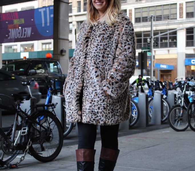 Getting ready for that 8:10am for class in the morning should never be a time consuming process. Most days I pull out my clothes the day before. There are times though when I don’t have time to or I forget with the million and one things I have going on. When this happens I go for my quickly pulled together ensembles. They usually involve an oversize top, some leggings, and a statement piece. This Fashionista is rocking a great oversize leopard print coat. Her look can be achieved effortlessly by pairing your coat with a pair of leggings and knee-high boots. She brought it all together with her smokey cat eye and rose pink lip color.