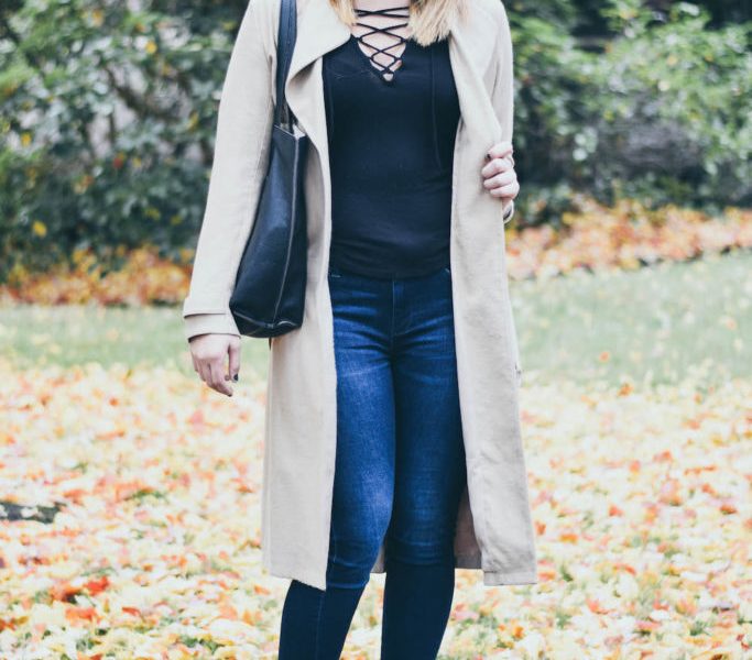 This Fashionista nailed this look perfectly! She is wearing a simple black shirt, but the tie-up V-neck helps catch your eye. I love details but you don’t want to go overboard with it. This Fashionista kept it simple with the jeans. The shirt, on the other hand, adds an edgy but chic vibe to the outfit; this piece really spices it up to get the look that she was striving for. Going with the theme of fall, she paired this outfit with a cute pair of black leather shoes. I love the look of leather in the fall, so these shoes add that needed touch! The jacket adds a classy look and dresses the outfit up a bit. People will definitely stop and take note of this fall-fashion look.