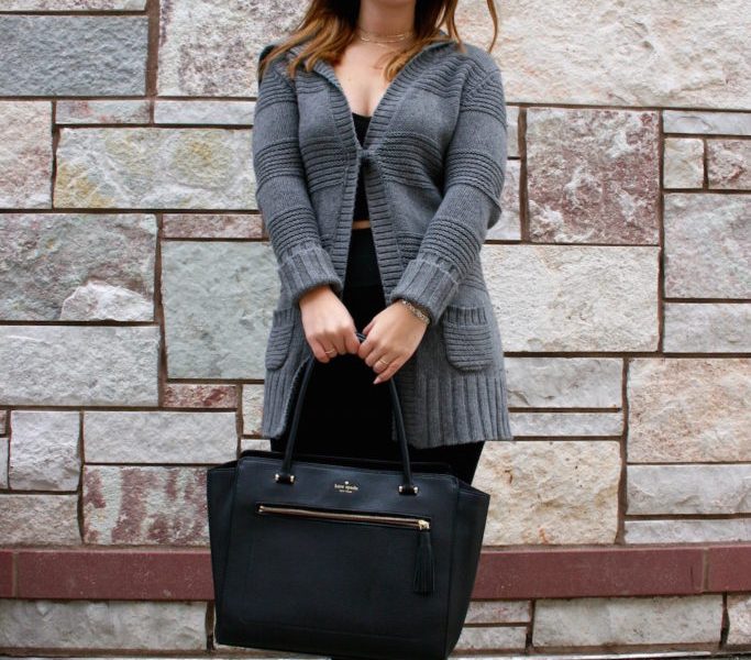 On her way to meet friends at a coffee shop, this Fashionista wears an outfit that is perfect for the start of a new semester. She wears a basic pair of black leggings with a plain black top. With such a neutral base, she allows her gorgeous gray cardigan and dainty jewelry to stand out. The design of the cardigan is interesting and works effortlessly as a statement piece in this look. While the outfit itself is beautifully simple, her jewelry elevates her look and adds a personalized touch.