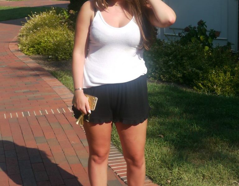 I was walking out of my dorm when I saw this Fashionista’s dainty gold jewelry and matching accessories. I love this look because she was wearing a minimalist outfit, a white tank with black shorts, but the look still had a touch of glam because of her accessories. The small gold bar necklace matched the simplicity of the outfit but the stacked bracelets and the cuff with the pop of orange gave the look a fun edge. The bralette added a softer element to the look and the light pink hue complemented the gold theme well.
