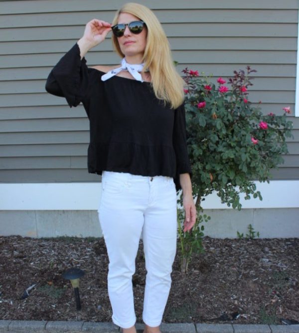 This Fashionista styled her choker by folding it and then tying a knot to the side. This effortless accessory made the outfit come to together. She took the choker trend to a whole new level of RAD! This trend is so unique yet so simple and inexpensive that is has got to blow up soon. The Fashionista then matched the choker with a black off-the- shoulder top to really draw attention to the white bandana. She wore loose white jeans and cute sandals to make the outfit more casual. Of course adding in Erika sunglasses from Ray-Ban screams a beautiful summer outfit.