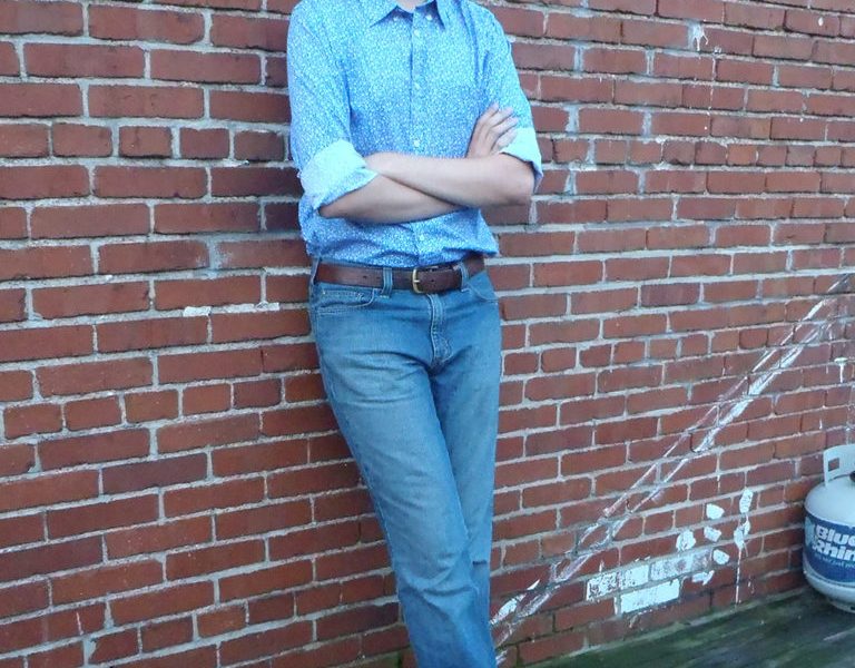 This Fashionisto dresses down his blue suede shoes with worn-in and cuffed jeans, a blue floral button-down, a one-of-a-kind leather belt and vintage felt hat.