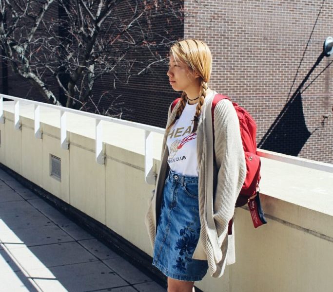 That’s why, when I spotted this Fashionista, my first words were “Ooo, yas girl!” Her jean skirt caught my eye across the campus yard. With just the detailing of navy flowers on either side of the skirt, it is a good intro piece for those who are afraid to step into the trend full on. Simplicity is key when trying out new trends; she tucked in a white Heat T-shirt with an oversize cardigan for optimum comfort while walking around campus. As far as accessorizing, this Fashionista kept it nice and clean to not distract from her skirt. She wore a black studded choker and braided up her hair in two old-school braids.