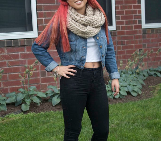 This Fashionista has been seen around campus during this fall midterm week, looking her raddest self. She is rocking a denim jacket and sneakers, which are two of the classic ’90s looks that are coming back into style for us millennials. This Fashionista has pulled in a trendy, knit scarf to really pull her fall look together. You also have to notice that she is wearing pretty monotone colors, careful not to have any one piece overpower another.