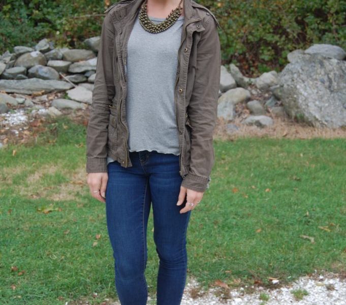 It is getting more chilly here in Rhode Island, especially with the wind by the water. A simple jacket like this olive toned one is a great asset to a chilly day. This outfit also seems really comfortable for class while still looking dressed up. The shirt is a simple tee that flutters in the back. The way the top fell in the back underneath the jacket was also a nice touch. The shoes are a staple for fall — beige booties are a must. The booties have an old time feel with the high set laces and it adds charm to the outfit overall. Her dark denim jeans pair nicely with the other colors in the outfit and I think they are better than a light wash would have been.