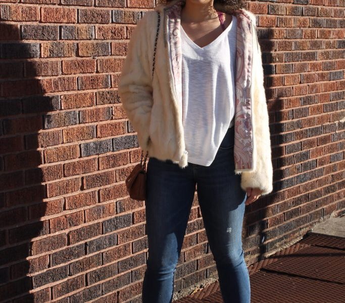 Okay, so from afar this outfit looks totally normal, right? A classic white T-shirt and blue jeans, normal. But wait, zoom in a bit, is that a jacket? Wait wait, keep zooming. A vintage jacket? Wait a vintage faux fur sport jacket? Okay, zoom a little more, there you go. Just look at all those details! See? I told you big picture is not the way to go.